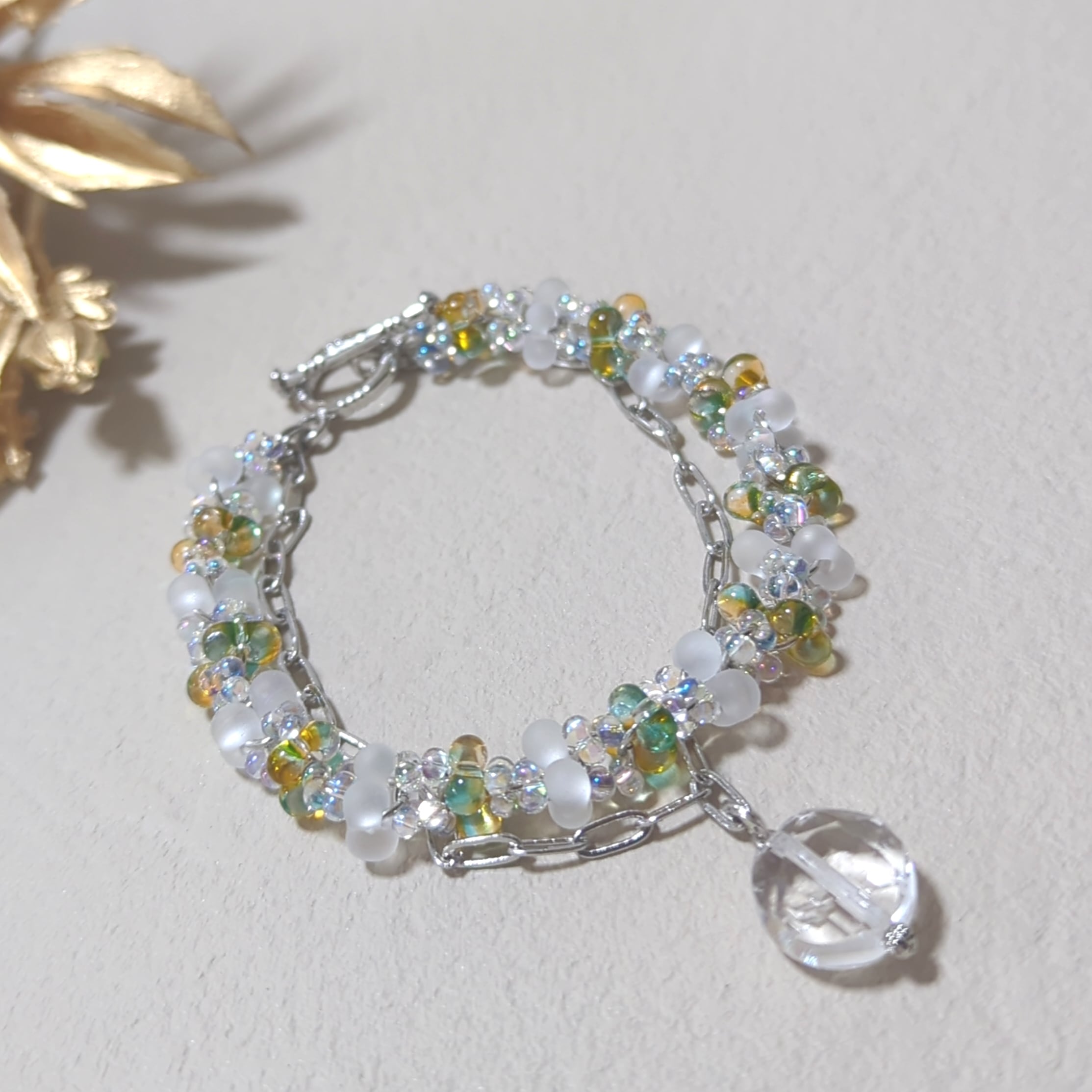 【検索ワード】ファルファーレビーズ チェコビーズ ビーズ 水晶 天然石 ブレスレット 2連 オフィス カジュアル 一点もの ゴールド 金色 キラキラ ハンドメイド 個性的 個性派 普段使い 大人可愛い 大人 女子 女子力 きれいめ かわいい 可愛い ギフト 贈り物 オールシーズン デート