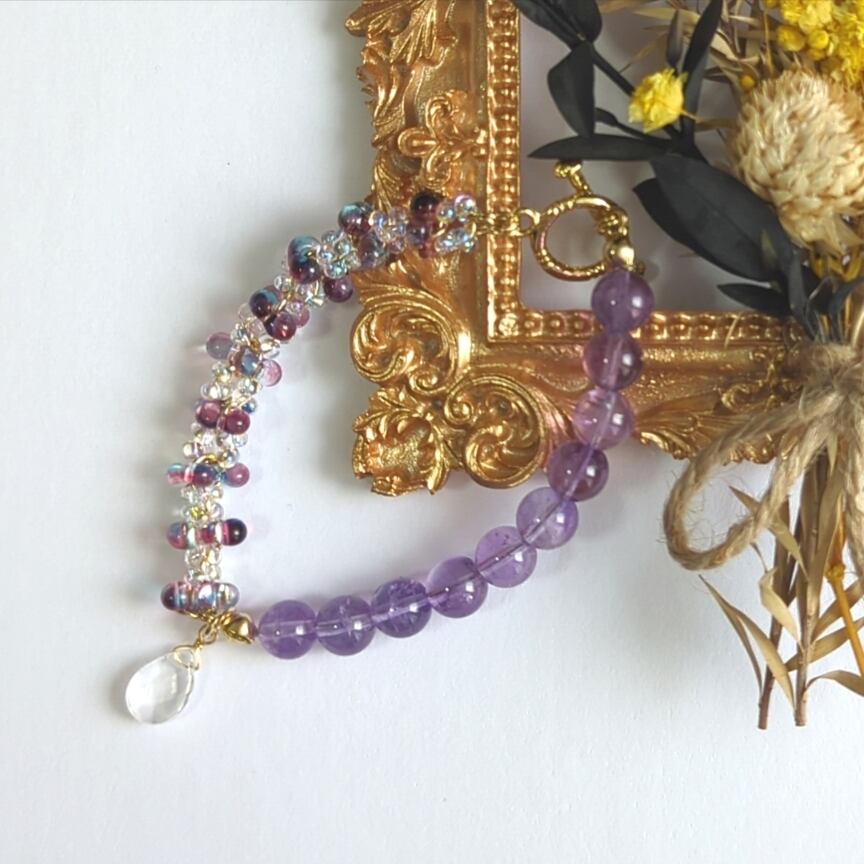 【検索ワード】ファルファーレビーズ チェコビーズ ビーズ アメジスト 天然石 ブレスレット グレー ホワイト アシメデザイン アシメ アシンメトリー オフィス カジュアル 一点もの ゴールド 金色 キラキラ ハンドメイド 個性的 個性派 普段使い 大人可愛い 大人 女子 女子力 きれいめ かわいい 可愛い ギフト 贈り物 オールシーズン デート