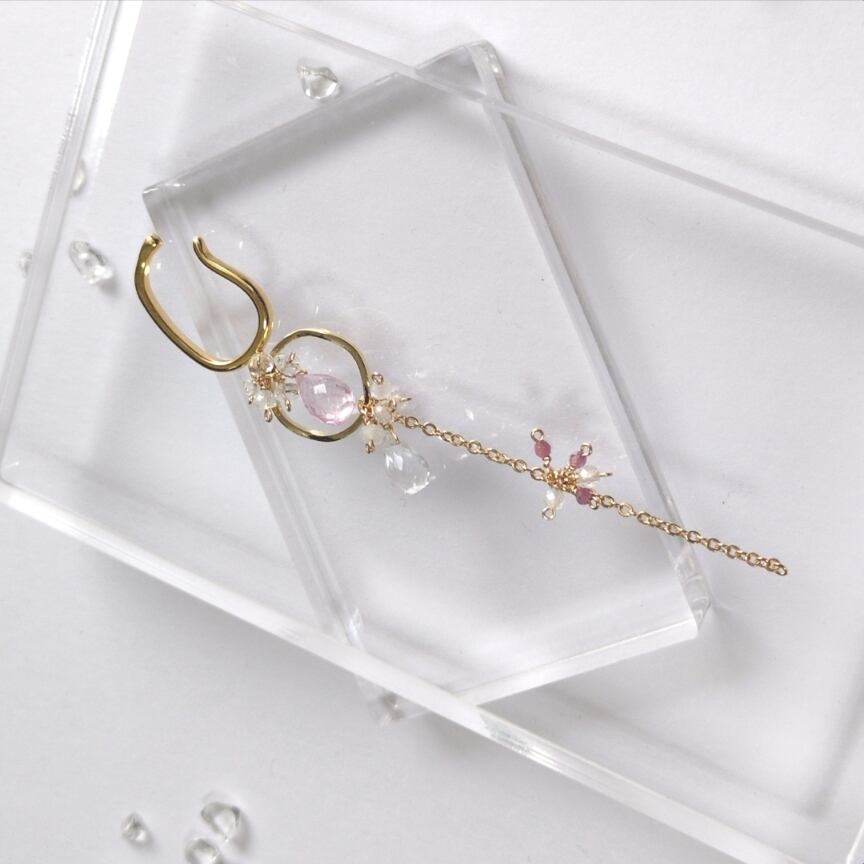 可愛らしい色味のピンクトパーズのドロップカットが目を引くロングイヤーカフです。
