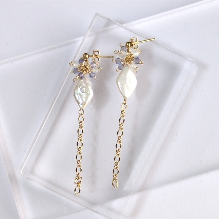 天然石 パワーストーン 淡水パール パール アイオライト ホワイトラブラドライト 天然石ジュエリー 一点物 アクセサリー オフィス カジュアル イヤリング ポストピアス フックピアス 一点もの ゴールド 金色 キラキラ ハンドメイド 個性的 個性派 普段使い 大人可愛い 大人 女子 女子力 きれいめ かわいい 可愛い オールシーズン 春 夏 秋 冬 デート