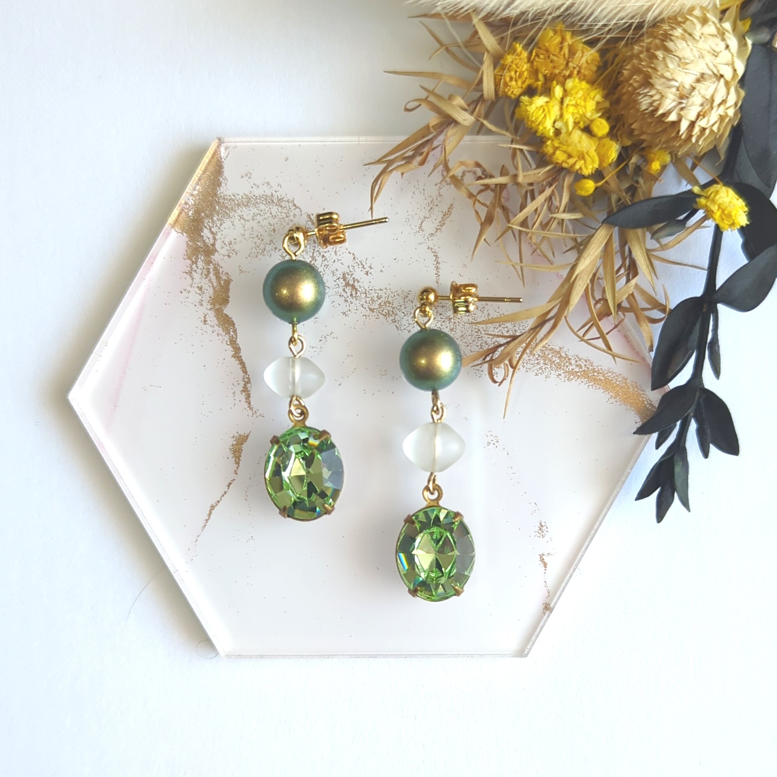 そんなヴィンテージガラスストーンにスワロパールのイラデサントグリーンを組み合わせて、2つの時代のスワロを楽しめます。