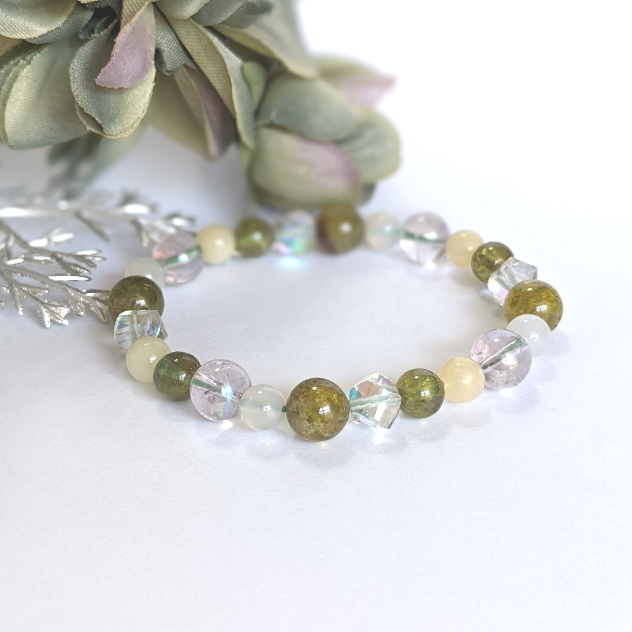 そんなグリーンガーネットをふんだんに使い、そこに柔らかなイエローのアラゴナイトやスターカットのルナフラッシュを組み合わせて