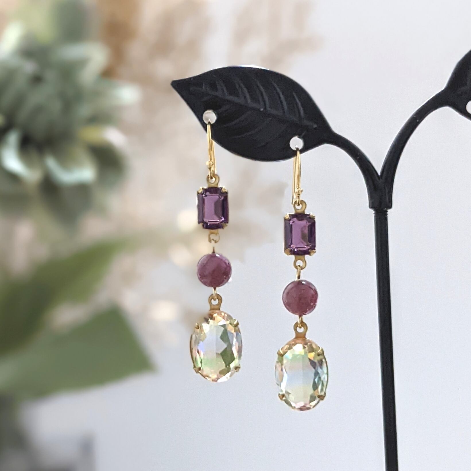 レインボーカラーの透明ガラスカボションと大人の色気溢れるパープルのヴィンテージスワロの耳飾り
