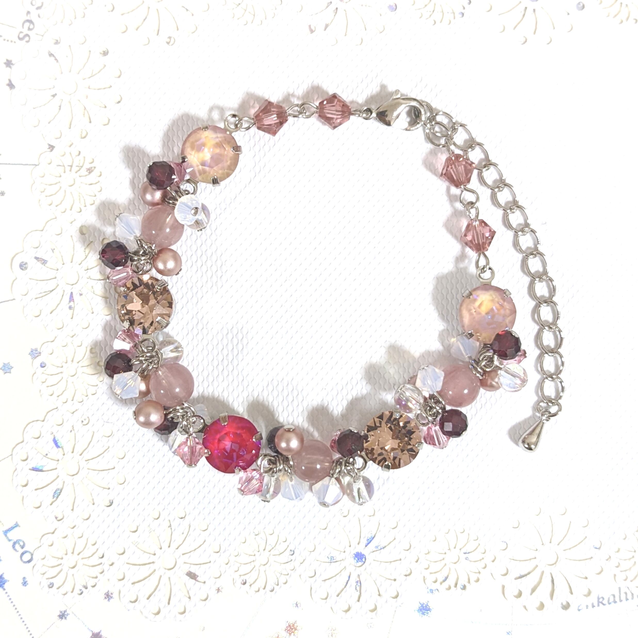 ディープローズクォーツやクリスタルビジューがきらめくブレスレット~ピンク系~