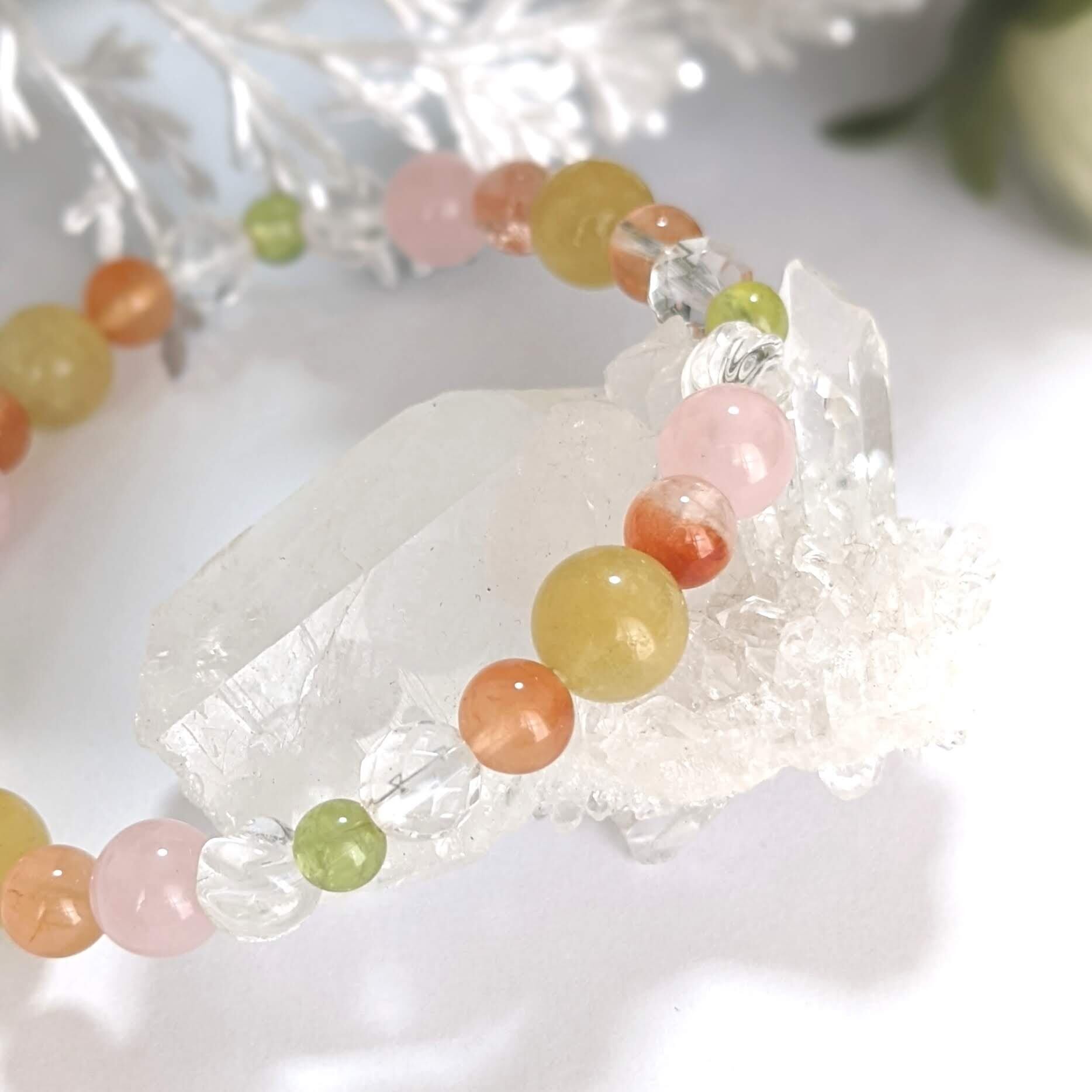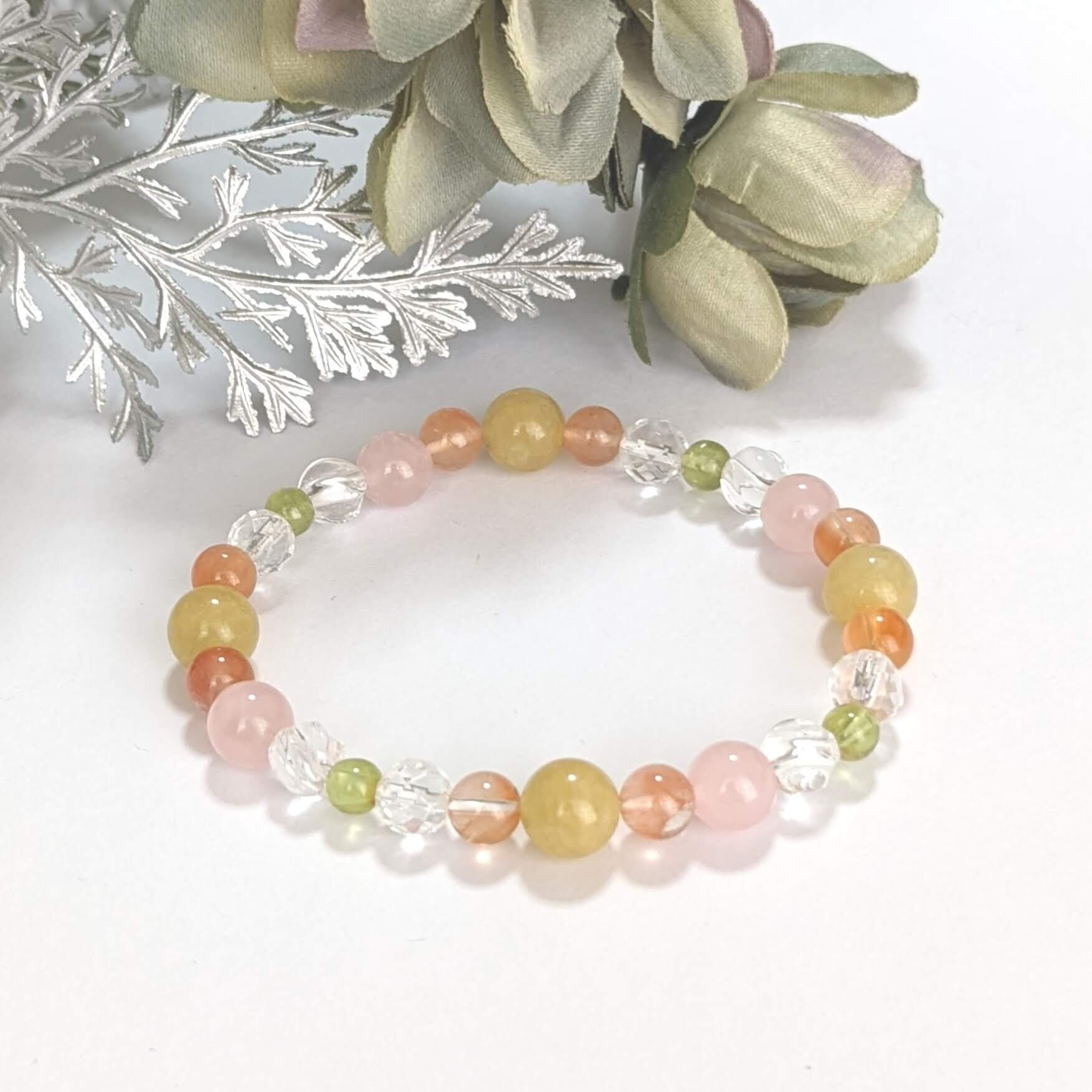 全体的にふんわり柔らかな色味のアンフィボールインクォーツやローズクォーツを組み合わせ、差し色でペリドットを。