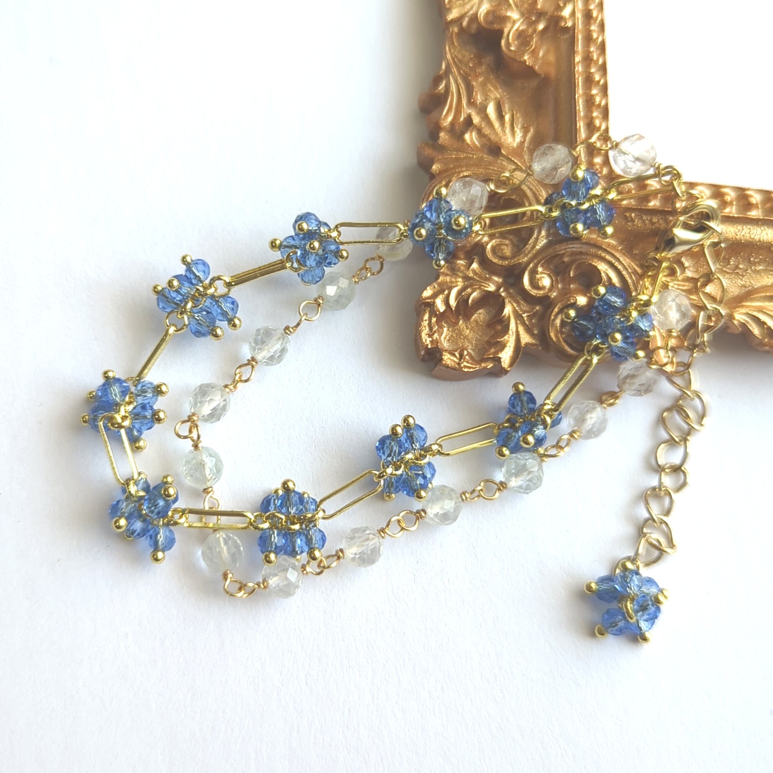 爽やかなブルーのガラスビーズとオーバルフープが連なったデザインのチェーンと2連に仕上げました。