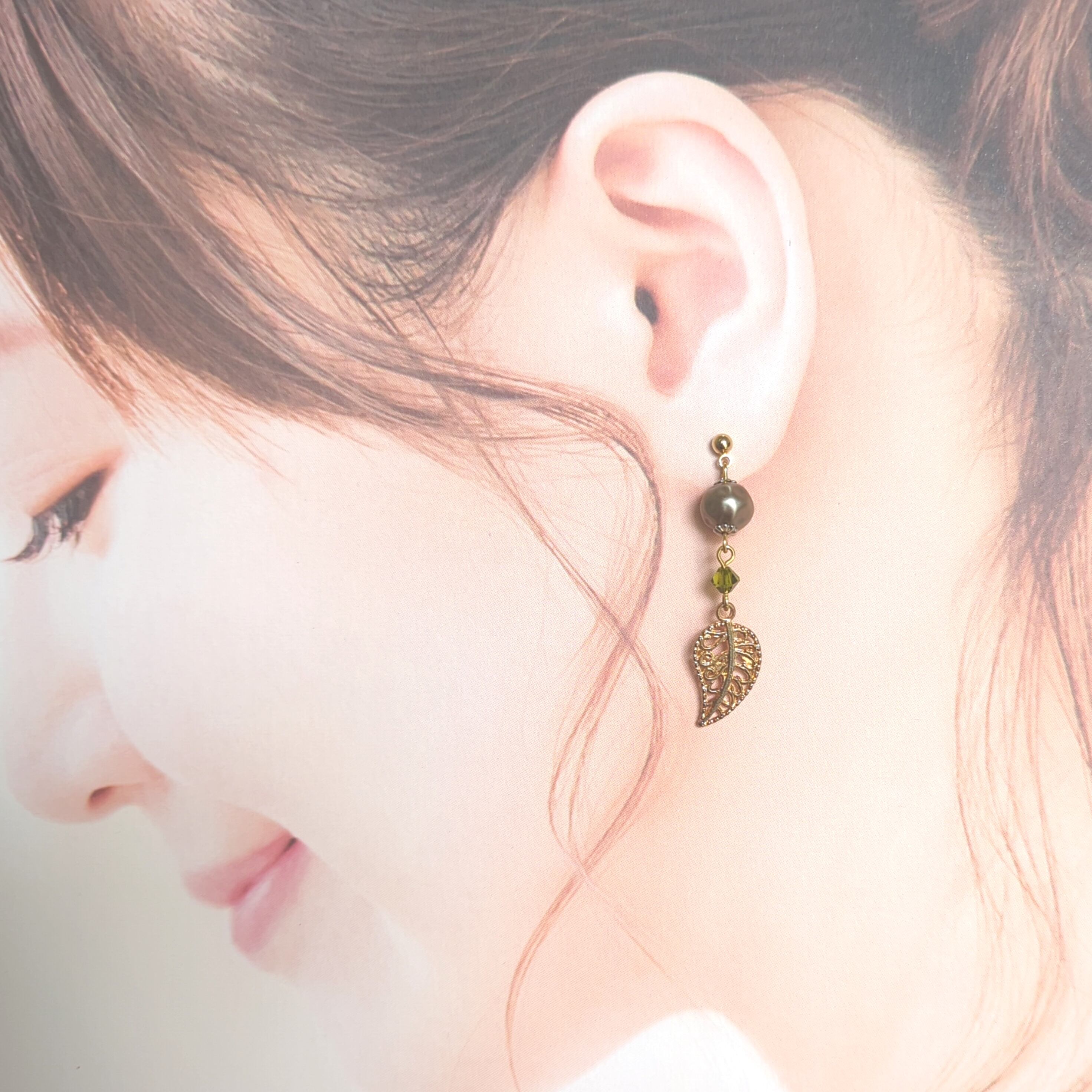 そこに小粒のスワロとリーフチャームを合わせてアシンメトリーのデザインにし、色味もデザインも大人っぽい仕上がりとなっております。