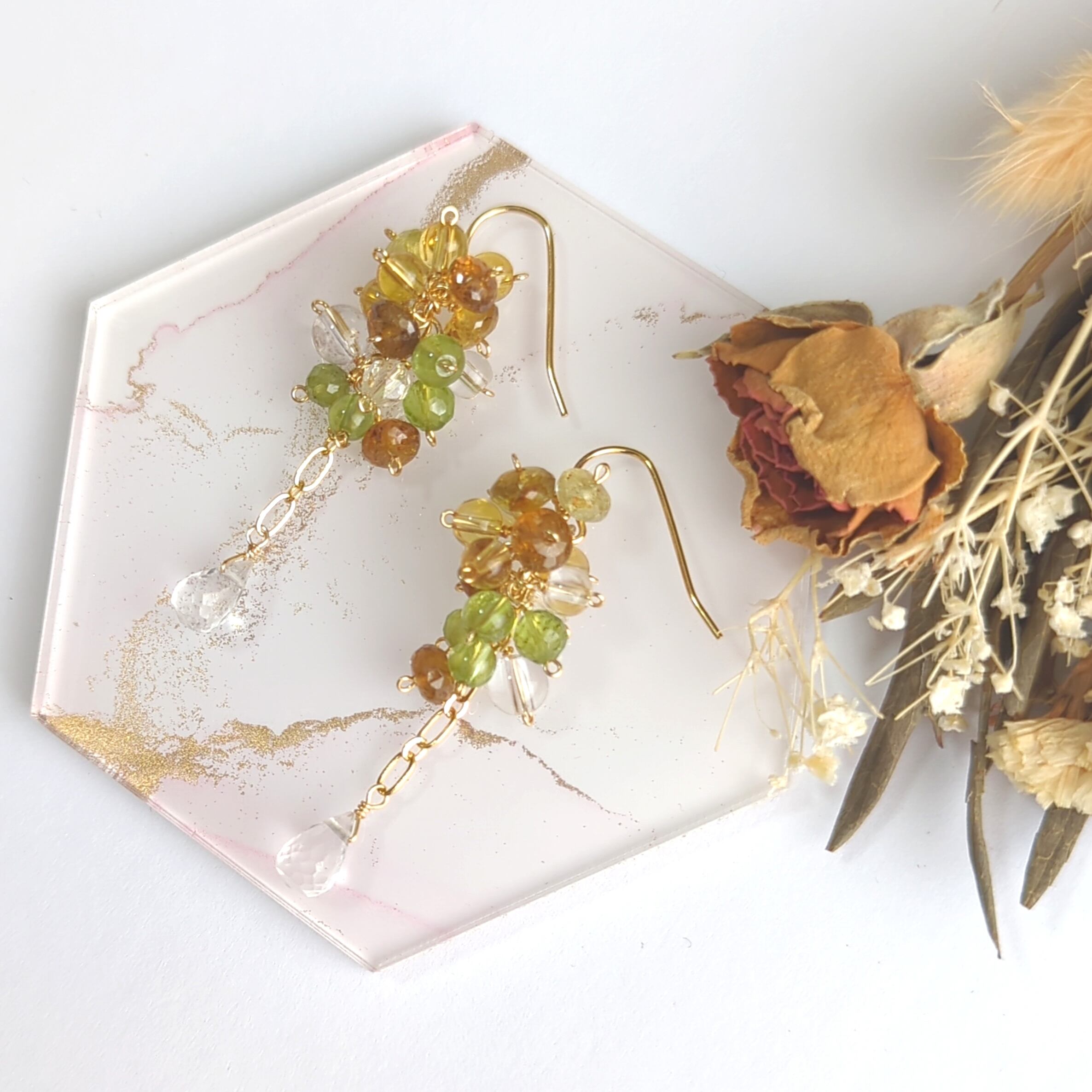 天然石 パワーストーン グリーンガーネット ガーネット シトリン 水晶 グリーン 緑 効果 天然石ジュエリー 一点物 アクセサリー オフィス カジュアル イヤリング ポストピアス フックピアス 一点もの ゴールド 金色 キラキラ ハンドメイド 個性的 個性派 普段使い 大人可愛い 大人 女子 女子力 きれいめ かわいい 可愛い オールシーズン 春 夏 秋 冬 デート