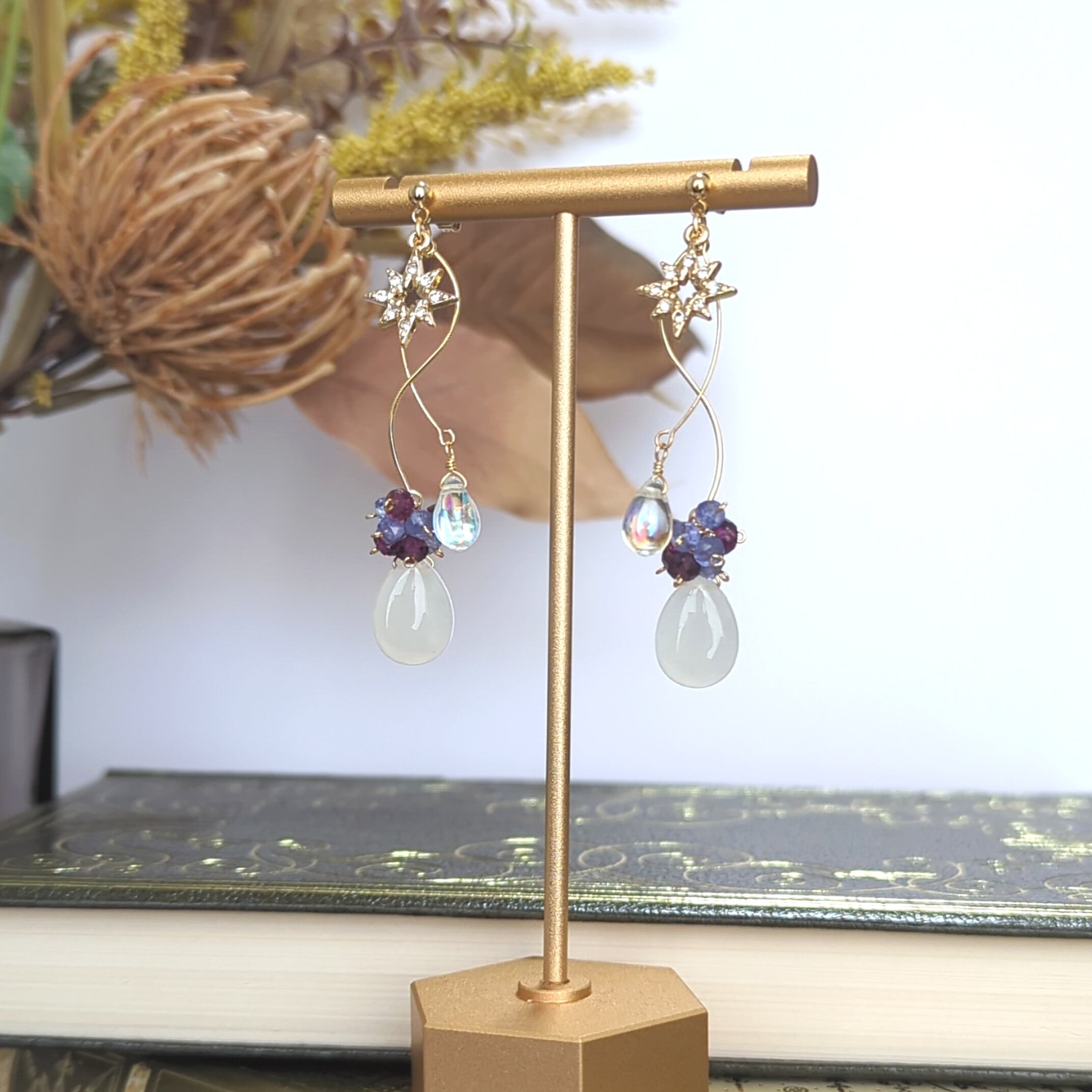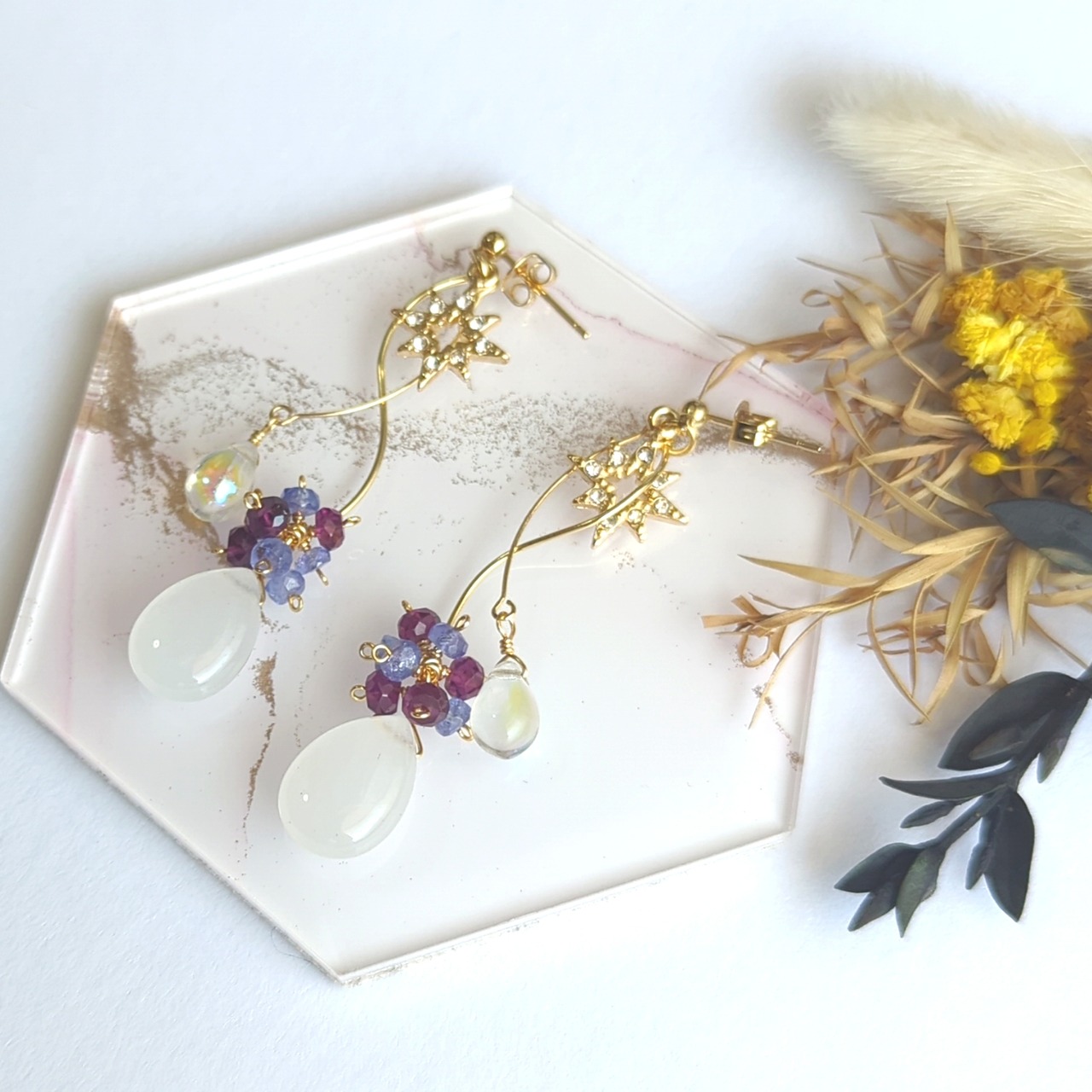 ホワイトジェードのドロップにタンザナイトとパープルガーネットがそっと寄り添うピアス(イヤリング変更可)